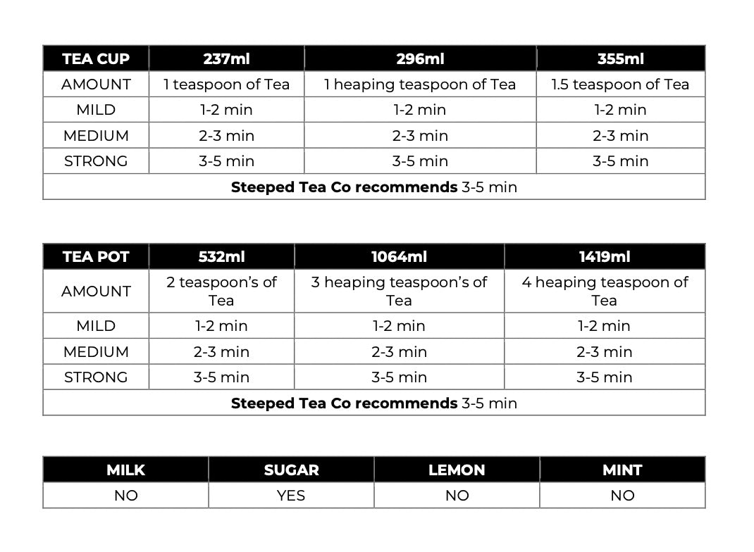 Serving Recommendations: Best served hot with sugar or sweetener (Please refer to image above for steeping recommendations).