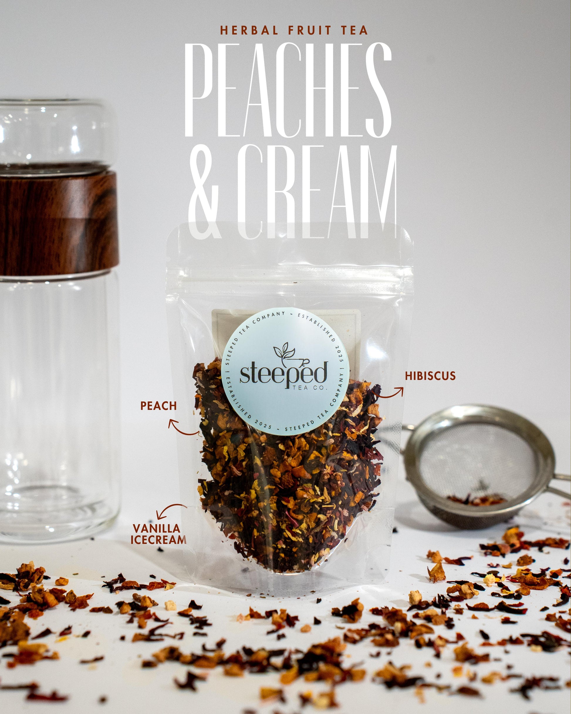 Experience the perfect blend of flavour with Peaches and Cream loose leaf tea. The rich, creamy notes of peach and hibiscus create a delightful and refreshing taste. Enjoy the perfect balance of sweetness and tartness with every cup. Available in 50 grams and 100 grams.