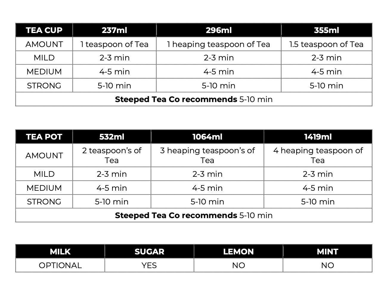 Serving Recommendations: Best served hot or iced, with sugar/sweetener (please refer to images above for steeping recommendations).